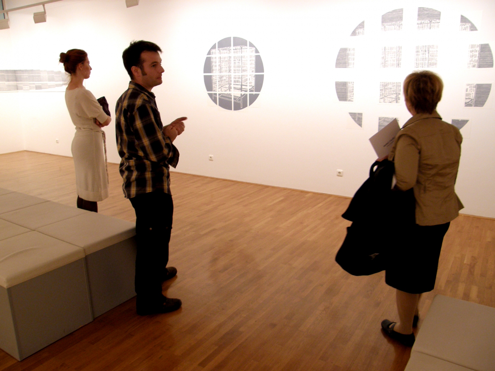 Na najnovijoj zagrebačkoj izložbi Mario Čaušić predstavlja izbor novih radova. Ono što je za njih, kao cjelinu, zanimljivo primijetiti jest sljedeće: da se ovdje radi o, znakovito za umjetnika, prostornim istraživanjima, da imaju nazive koji ih tumače (ovdje je važno uočiti i autorovu sklonost ka igri s riječima) te da su često osmišljeni u serijama i varijacijama kroz koje propituju ideju mijene te nastajanja i nestajanja (ovisno s koje strane seriju iščitavamo). Radovi In i Out te Spacemaker 1 pripadaju ovoj posljednjoj kategoriji. Umjetnik istu matricu rezbari do neraspoznavanja. Na taj način, dodavanjem reljefa (Mario Čaušić), on “zamućuje” prizor, kao na ekranu čija se slika kvari, ili se pak ona razbistrava odaberemo li krenuti, za zapadnu kulturu nekonvencionalno, s desna na lijevo. Autor ovaj izbor ostavlja slobodnim. Također, ne možemo se ne prisjetiti impresionističkih “serijskih” prikaza istog motiva pri različitim osvjetljenjima. Postupak nije identičan niti identično motiviran, ali naslućuje se postmoderno variranje odjeka (moderno) klasičnih uzora. Uočljivo je i parodiranje “intimističkih” tema interijera i dražesne kućice u eksterijeru. Spacemaker 2 je prostorna instalacija izrađena od paralelnih valovitih perforacija koje se spuštaju iz gornjeg lijevog prema donjem desnom kutu površine. Kvadratna ploha bijelog papira je kroz dvije središnje četvrtine razbijena pravokutnim, horizontalno položenim, sivim poljem. Smišljena da slobodno stoji u prostoru, potiče razmišljanja o mijenama oblika kroz prostorno i vremensko kretanje, viđenih kroz koprenu, koja zamućuje jasan i objektivan pogled te proizvodi zabune i kriva iščitavanja. Rad Dang koristi multiplikaciju kao specifičnu karakteristiku grafičkog medija kako bi promijenio ili bolje reći deformirao virtualni prostor na grafičkom listu (Mario Čaušić). Autor je izrezao više istih otisaka jedne grafike u tanke trake te ih ponovno spojio u jedan novi prostor i razvukao grafiku od približno 50 cm na dužinu od 500 cm. Rad je dodatno definiran specifičnim postavom, koji naglašava prostornost te su autoru na njemu naročito zanimljivi efekti svjetlosti, jer stvaraju specifične teksture i, svojevrsnu, opartističku kvalitetu cjeline (rezanim trakama grafike autor se već ranije poslužio, iako s drugačijim ishodom, u radu Dimenzija, 2007.). Naziv rada Dang želi evocirati zvuk (sam rad se, osim toga, asocijativno može iščitati i kao grafički prikaz kvalitete zvuka) te operira na području sinestezijskog prizivanja “slušanja umjetnine”. Bi_lbo_rd varira isti motiv na dva načina. Identična apstraktna konstrukcija, prošarana okomitim rezbarenjem, u kružnom polju na prvom je dijelu rada horizontalno podijeljena na gornji dio u slijepom tisku (teže čitljiv) i donji u visokom (jasno vidljiv), dok je u drugom ova podjela načinjena po vertikali. Prema riječima Marija Čaušića, dijelovi koji su rađeni u slijepom tisku iz veće udaljenosti postaju nečitki i samim tim gotovo nepostojeći, odnosno nepripadajući ostatku rada. Dok su dijelovi otisnuti u visokom tisku jasni. Rad zapravo nije prikazan u “jasnom” obliku u cijelosti, već parcijalno, ali ipak dovoljno da stvori potpunu mentalnu sliku prostora kod promatrača. Isti postupak primjenjuje i u nazivu rada, gdje izostavljanjem pojedinih slova, promatrač osjeća unutarnji imperativ da svojim vlastitim mentalnim naporom složi lingvističku i smislenu cjelinu, kao što je u navedenom likovnom primjeru morao složiti vizualnu, mentalnim popunjavanjem na osnovi nagovještaja. Na taj način rad propituje psihološko-fiziološke procese ljudske percepcije.