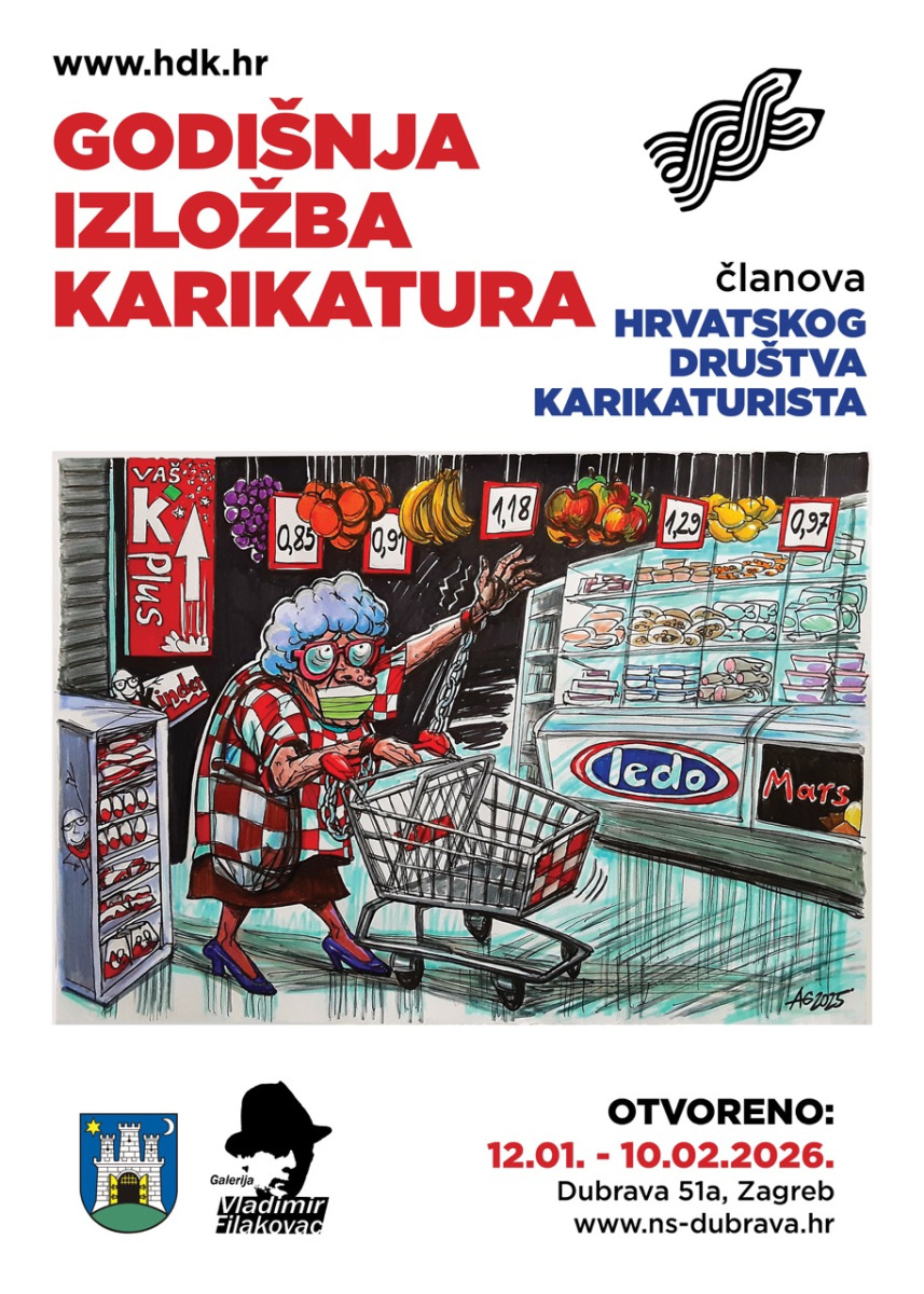 U Galeriji Vladimir Filakovac, Dubrava 51 a, otvorit će se 12. siječnja u 19 sati “Godišnja izložba karikatura članova Hrvatskog društva karikaturista” pod nazivom „Teme, događaji i osobe u 2025.“. Izložba se može razgledati do 10. veljače 2026., radnim danom od 10 do 20 sati. Ulaz je besplatan.