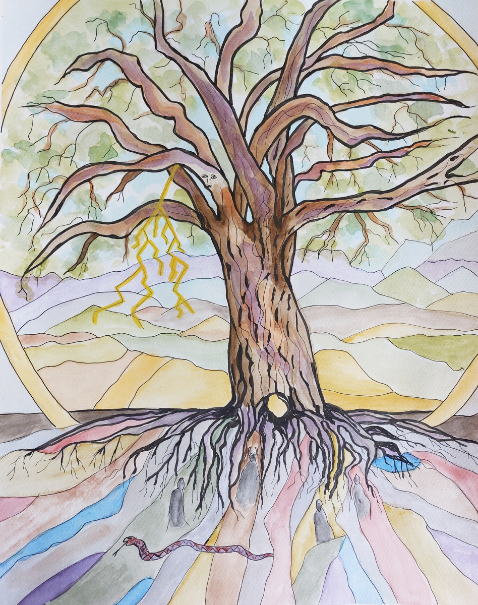 Vilinski ples Alenke Tominac u krugu nad vodom i ”Drvo svijeta” Ljiljane Tršan govore o takvoj jednoj potrazi za izgubljenom čarolijom, kada je suživot sa prirodom bio središnje mjesto svetih rituala, unutar kojih se odvijalo ”mistično sjedinjenje” duha i materije kroz različite elemente, u težnji da se sagleda cjelovita slika svijeta i našeg mjesta u njemu. Dualnosti Peruna i Velesa na svojoj slici dočarava nam i Dubravka Lukić kroz odnos horizontalno položene bijele zmije i vertikalnih stabala koja se prijeteći nadvijaju nad njom, simbolizirajući sukob različitih sila, reda i kaosa, koji se stalno izmjenjuje u prirodi i ljudskom društvu. ”Veles” Jelene Martinović u mitskoj metafori podsjeća nas na stare kulteve stočarskih nomadskih naroda, koji su tražili svoje mjesto pod suncem i životinjama od kojih je ovisilo njihovo preživljavanje, često su pripisivali nadnaravne osobine.