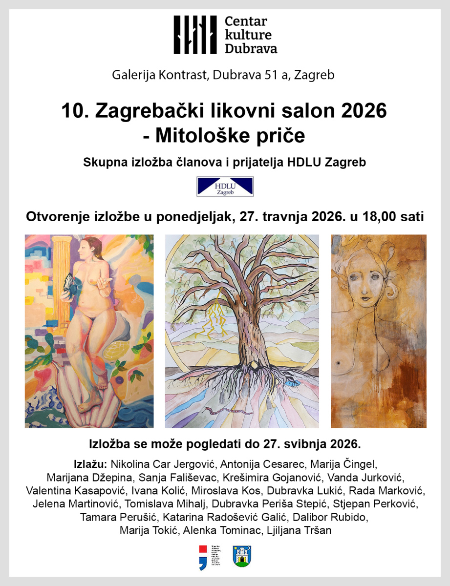U Galeriji Kontrast, Dubrava 51 a, otvara se 27. travnja u 18 sati skupna izložba slika članova i prijatelja HDLU Zagreb pod nazivom ‘’10. Zagrebački likovni salon 2026. – Mitološke priče’’. Izložba će se moći pogledati do 27. svibnja 2026., radnim danom od 10 do 20 sati. Ulaz je slobodan.